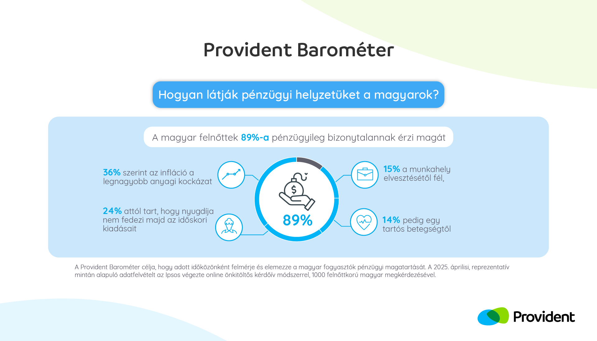 Kevesek kiváltsága Magyarországon az anyagi biztonság: a lakosság döntő többsége (89%) egzisztenciális szempontból bizonytalanságot érzékel, a felnőtt népesség alig néhány százaléka érez maga mögött stabil pénzügyi hátteret. A legtöbben változatlanul az inflációtól tartanak, ezt a megkérdezettek bő harmada (36%) nevezte meg első számú anyagi veszélyként. Az időskori anyagi biztonság a második legnagyobb félelem: minden negyedik válaszadó (24%) aggódik amiatt, hogy a nyugdíja nem fedezi majd az időskori kiadásait. A megkérdezettek számára stresszforrást jelent a munkahely elvesztésétől (15%), vagy egy tartós betegségtől (14%) való félelem is. Ezek a legfontosabb megállapításai a 18 évnél idősebb hazai népesség körében végzett reprezentatív Provident Barométer kutatásnak.