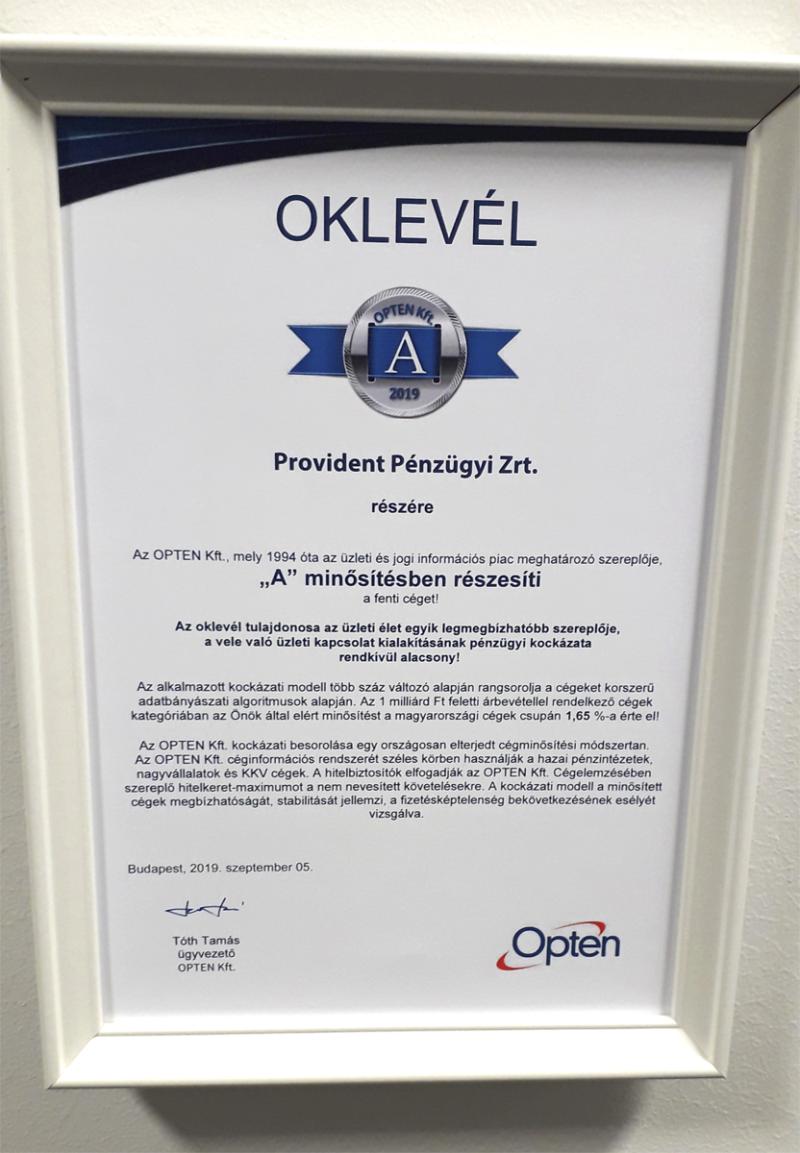 Az Opten céginformációs szolgáltató „A” szintű minősítésben részesítette a Provident Pénzügyi Zrt-t. Az értékelés alapján „a pénzintézet az üzleti élet egyik legmegbízhatóbb résztvevője; az audit eredmények alapján a vele kialakított üzleti kapcsolat pénzügyi kockázata rendkívül alacsony.”