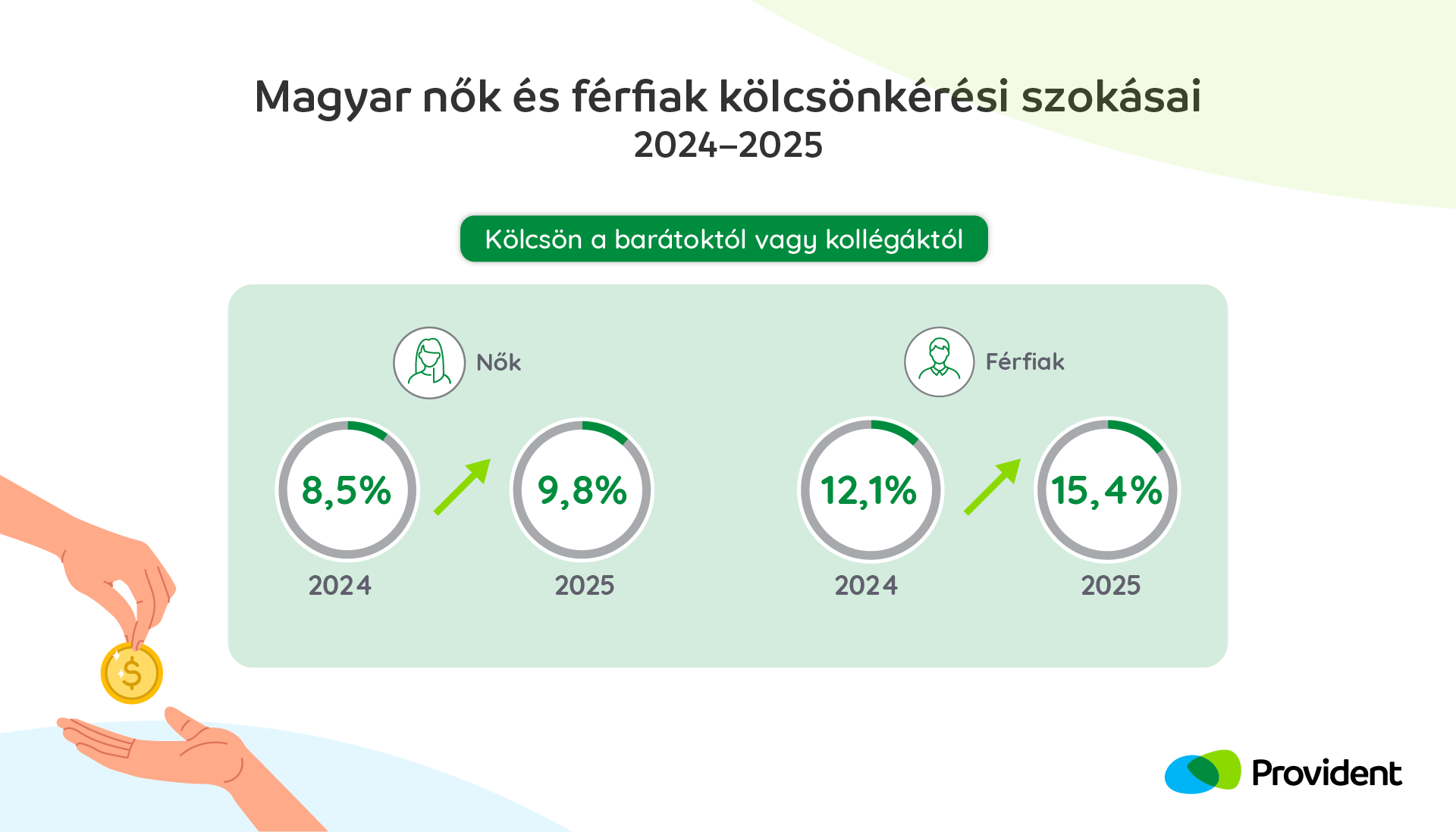 Érdekes tény, hogy a magyarok az elmúlt egy évben összességében nemcsak a családtagoktól, hanem barátoktól, kollégáktól is nagyobb arányban (12,5 százalékban) kértek kölcsönt, mint a pénzintézetektől, pénzügyi szolgáltatóktól. Ugyanez rajtunk kívül csak a litvánokról mondható el (náluk még nagyobb az olló, 15,8 vs. 10,9 százalék). A többi hét vizsgált ország lakói viszont a pénzügyi intézményeket részesítik előnyben, ez is magyarázza a 13,3 százalékos nemzetközi átlagot. A magyar középértéket a férfiak húzták fel, akik közül a barátoktól, kollégáktól is jóval többen kértek anyagi segítséget, 15,4 százalékuk az egy évvel korábbi 12,1 százalékkal szemben, miközben a nőknél is nőtt ez az arány, igaz, 8,5-ről csak 9,8 százalékra.