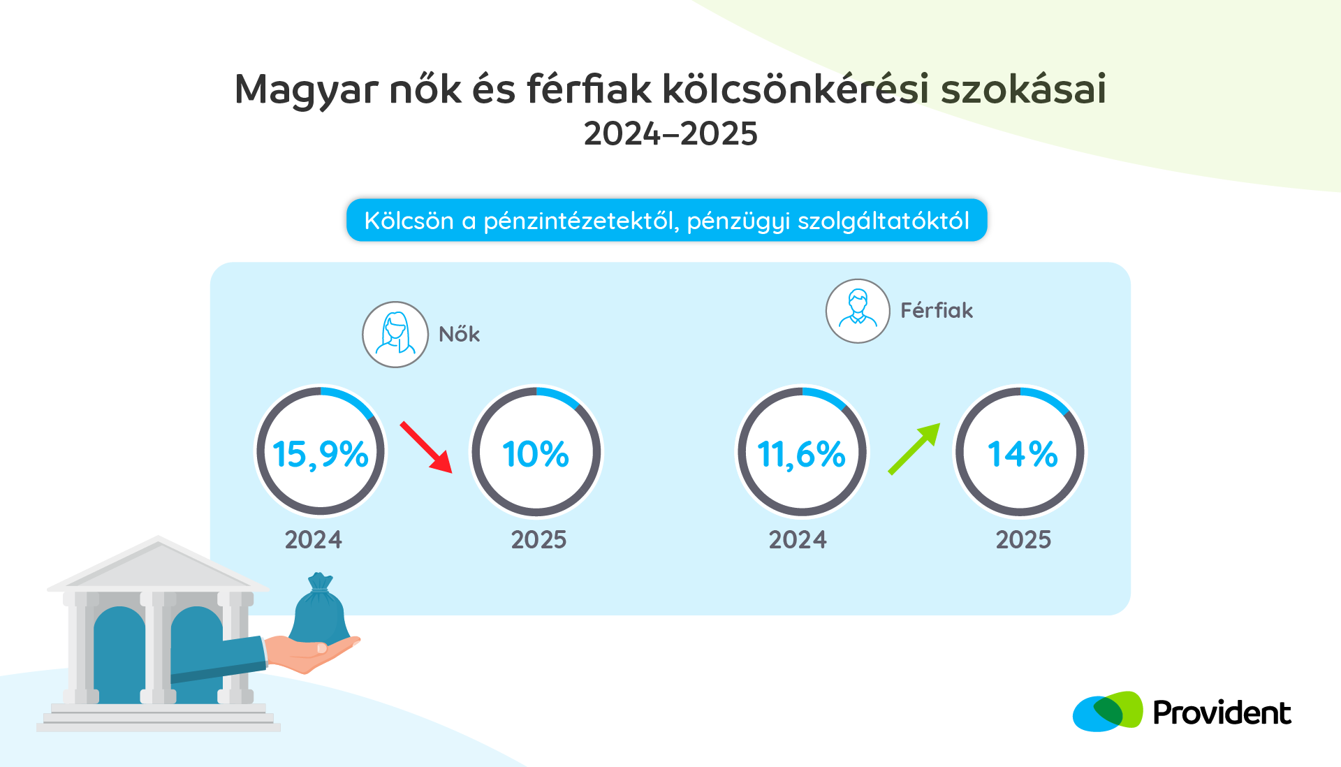 A magyar nők esetében az elmúlt egy évben gyakoribb volt ez a jelenség, vagyis – ha alig valamivel is, de – még az előző felmérésnél is nagyobb arányban (31,6 helyett 31,8 százalékban) kértek anyagi segítséget a családtagjaiktól, szemben a férfiakkal, akiknek már csak a 23,2 százaléka élt ezzel a lehetőséggel a 2024-es 25,1 százalék után. Ehelyett, úgy tűnik, hogy az erősebbik nem képviselői inkább a pénzintézeteket, pénzügyi szolgáltatókat preferálták jobban – amiben a hazai hitelkamatok enyhe csökkenése is közrejátszhatott –, az egy évvel korábbi 11,6 százalék helyett 14 százaléknyian igényeltek kölcsönt. Ennek éles kontrasztjaként a nőknél ez az arány 15,9-ről 10 százalékra csökkent, ami az országos átlagot is levitte 13,8-ról 12 százalékra.