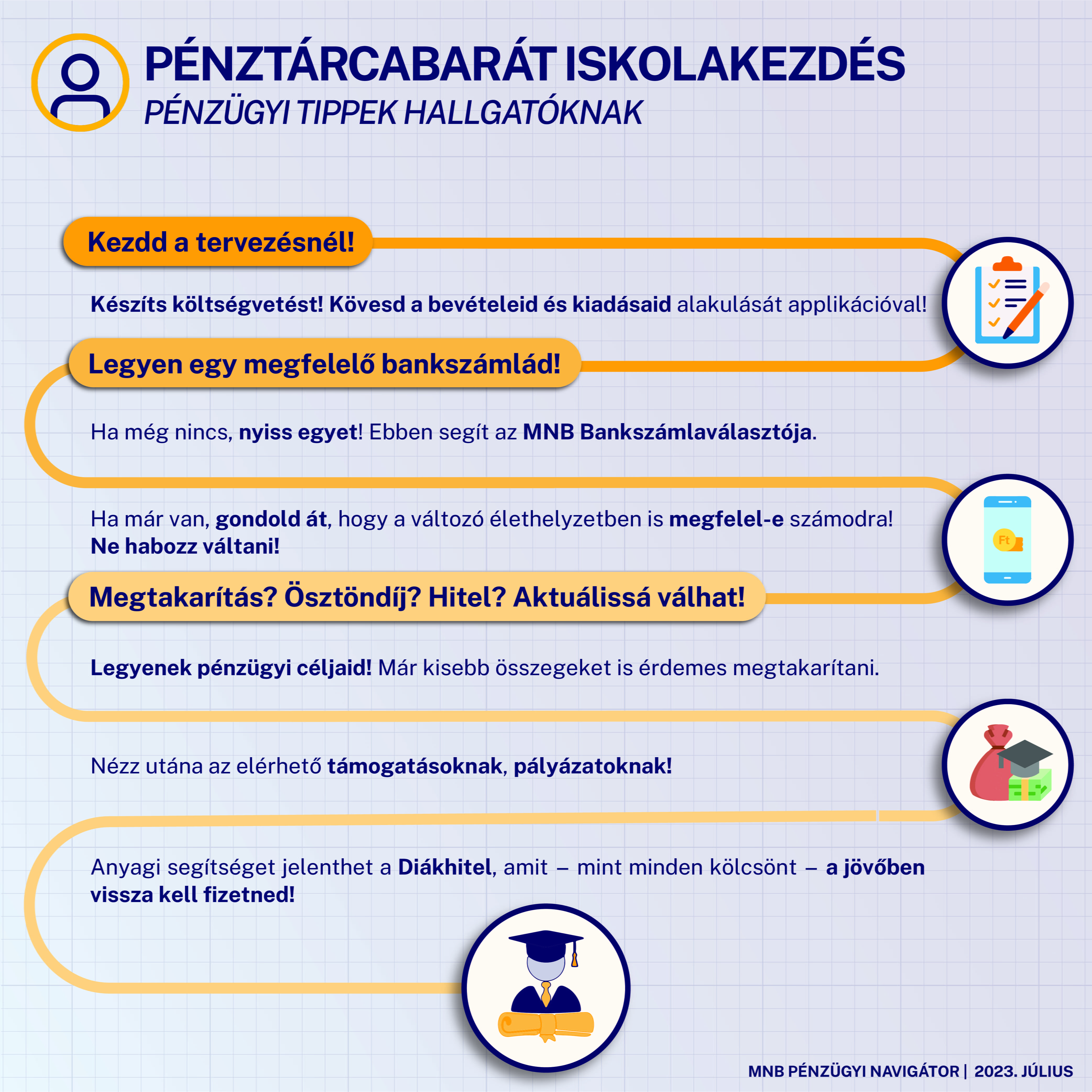 Felsőfokú tanulmányaid megkezdésével a pénzügyek terén is érdemes bővíteni ismereteidet. Pénzügyekről diákoknak, valamint Pénzügyi tippek életkezdéshez című Pénzügyi Navigátor füzeteinkben ehhez további hasznos tudnivalókat találsz.