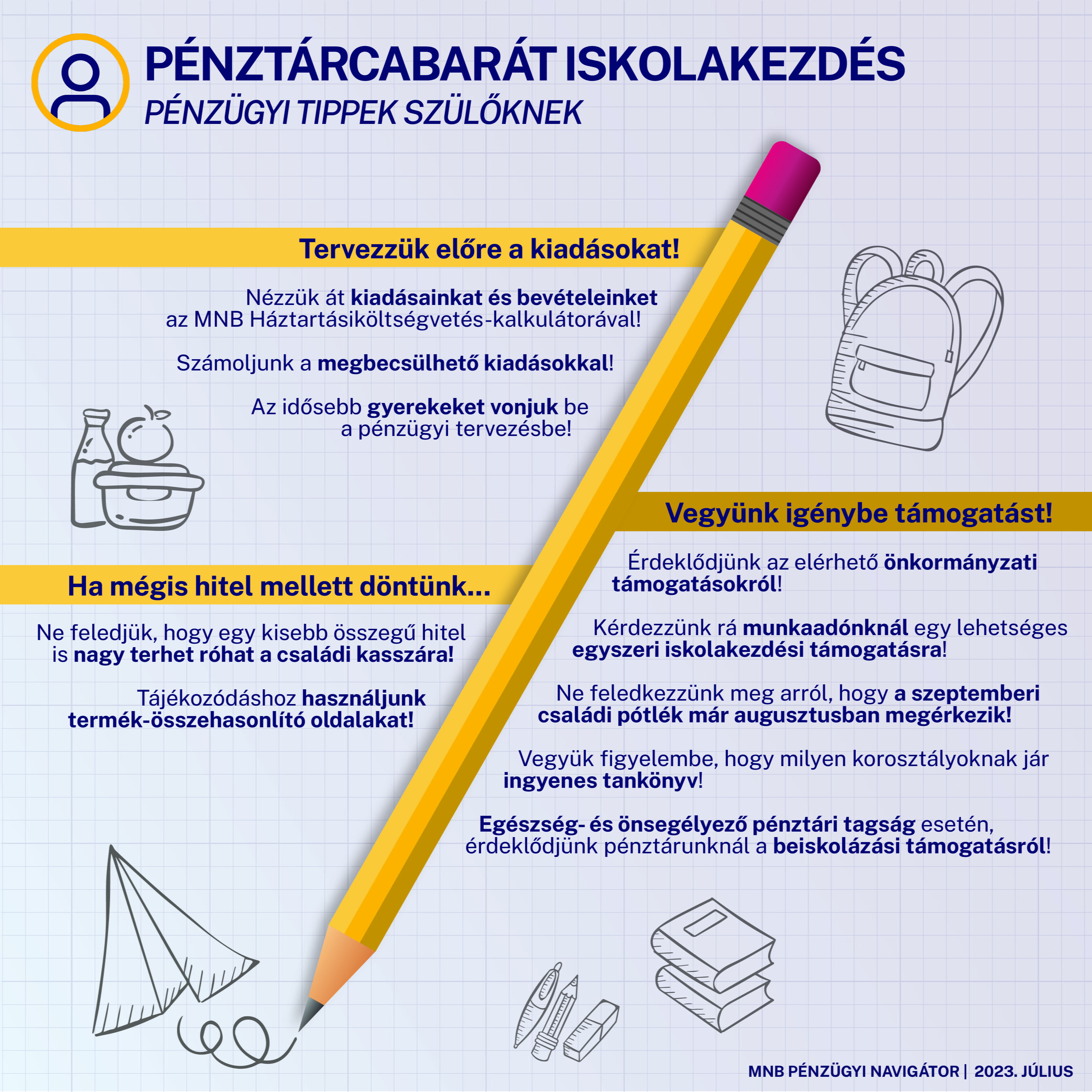 Előfordulhat, hogy az iskolakezdéssel járó kiadásokat nincs lehetőség teljes mértékben saját forrásból fedezni, még támogatások és kedvezmények igénybevétele mellett sem. Ilyen esetben jelenthet segítséget egy hitelfelvétel. Fontos azonban szem előtt tartani, hogy már egy kisebb összegű hitel is jelentős és hosszú távú anyagi kötelezettséget jelent a család számára. Érdemes ezért körültekintően, több konstrukciót megvizsgálva és összehasonlítva választani. A megfontolt hitelfelvétel szempontjairól bővebben olvashat a Hitelfelvétel tudatosan című Pénzügyi Navigátor füzetből, míg a gyorskölcsönökről és a fogyasztási hitelekről szóló tájékoztatóink e kölcsöntípusok jellemzőit ismertetik.