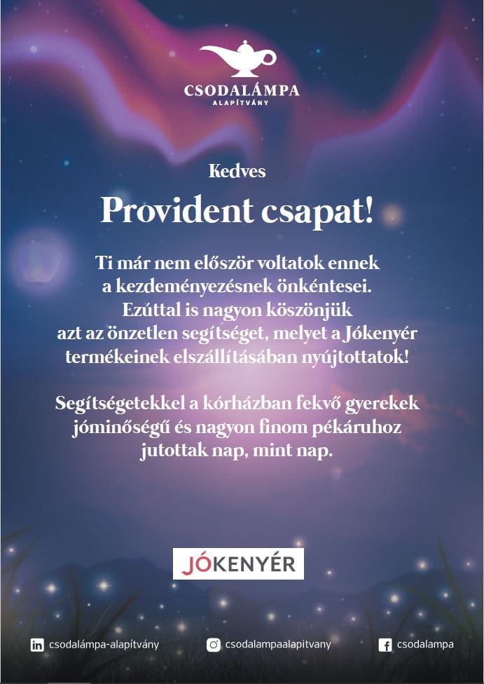 „Évről évre egyre több kolléga jelentkezik, hogy ők is szívesen vennének részt a kezdeményezésben, mert hallják egymástól, hogy milyen lélekemelő dolog részt vállalni ebben a megmozdulásban. Egy-egy önkéntesünk a teljes időszak alatt mintegy három alkalommal került sorra, hogy összegyűjtse az eladatlan finomságokat, és elszállítsa a kórházba. Ez volt a negyedik alkalom, amikor összefogtunk a Jókenyérrel, és 2024-ben az ötödik évfordulóra egy különleges meglepetéssel készülünk majd” – árulta el Pálfalvi Márta, a Provident Pénzügyi Zrt. vállalati kapcsolatok és kommunikációs igazgatója.