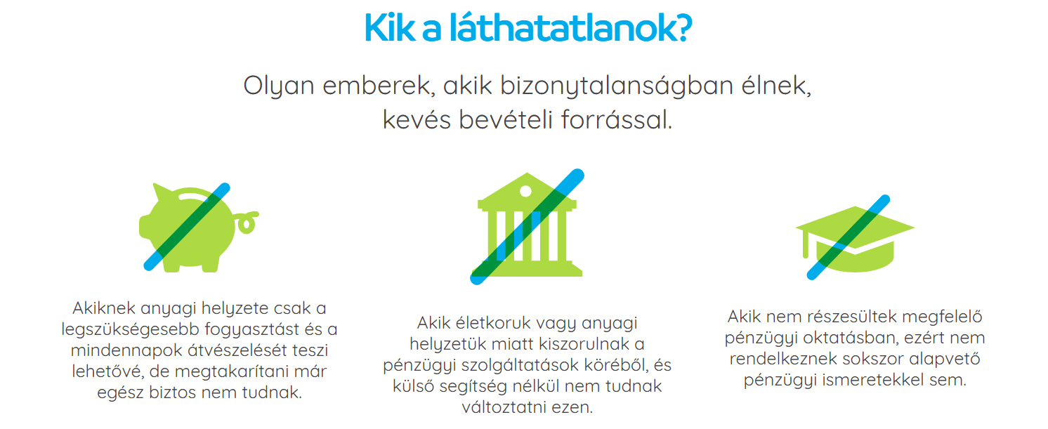 A Provident Pénzügyi Zrt. az indulása óta kiemelt figyelmet szentel a nehéz anyagi helyzetben élő társadalmi rétegeknek annak érdekében, hogy minden állampolgár hozzáférjen az átlátható és tisztességes pénzügyi konstrukciókon alapuló hitel lehetőségéhez. Ma Magyarországon a felnőtt lakosság 6 százaléka, vagyis mintegy félmillió állampolgár számára elérhetetlenek a klasszikus hitelpiaci termékek, ami még kiszolgáltatottabbá teszi ezt az amúgy is nagyon sérülékeny társadalmi csoportot. Hitelek nélkül a szegényebb rétegek számára gyakran még elérhetetlenebbé válik a társadalmi mobilitás lehetősége, valamint jelentősen megnő az adósságcsapdához vezető megoldások kockázata, beleértve az illegális hiteltermékekhez való fordulást is. Láthatatlanok program keretében a pénzügyi szolgáltató azok számára szeretne segítséget nyújtani, akik képtelenek a megtakarításra szűkös életkörülményeik miatt, akik életkoruk vagy anyagi helyzetük következtében kiszorulnak a hagyományos pénzügyi szolgáltatások köréből, valamint akik nem részesültek megfelelő oktatásban ahhoz, hogy felelős döntéseket hozhassanak a pénzügyeikkel kapcsolatban.